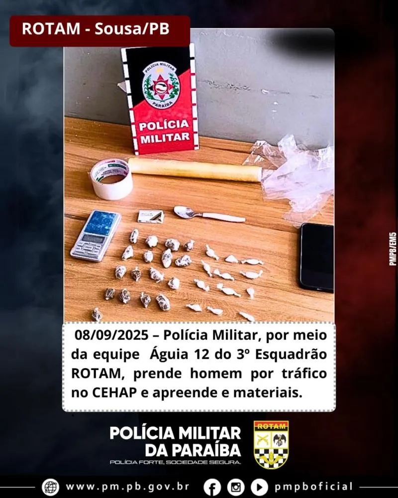 Na manhã desta segunda-feira (08), por volta das 09h15, a guarnição Águia 12 do 3º Esquadrão ROTAM prendeu um homem por tráfico de drogas no bairro CEHAP, em Sousa-PB. O suspeito tentou fugir ao avistar a guarnição, sendo alcançado dentro de uma residência.